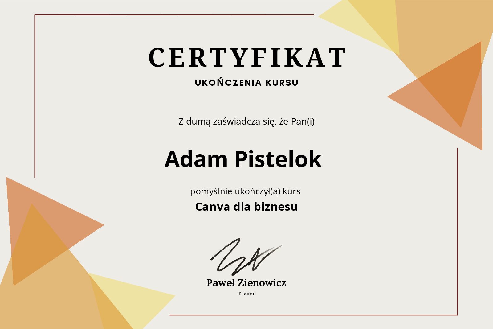 Z przyjemnością mogę ogłosić, że właśnie ukończyłem szkolenie Canva dla Biznesu. Było to niezwykle inspirujące doświadczenie, które pozwoliło mi jeszcze lepiej poznać możliwości jednego z najpopularniejszych narzędzi do tworzenia grafik, prezentacji i materiałów marketingowych.